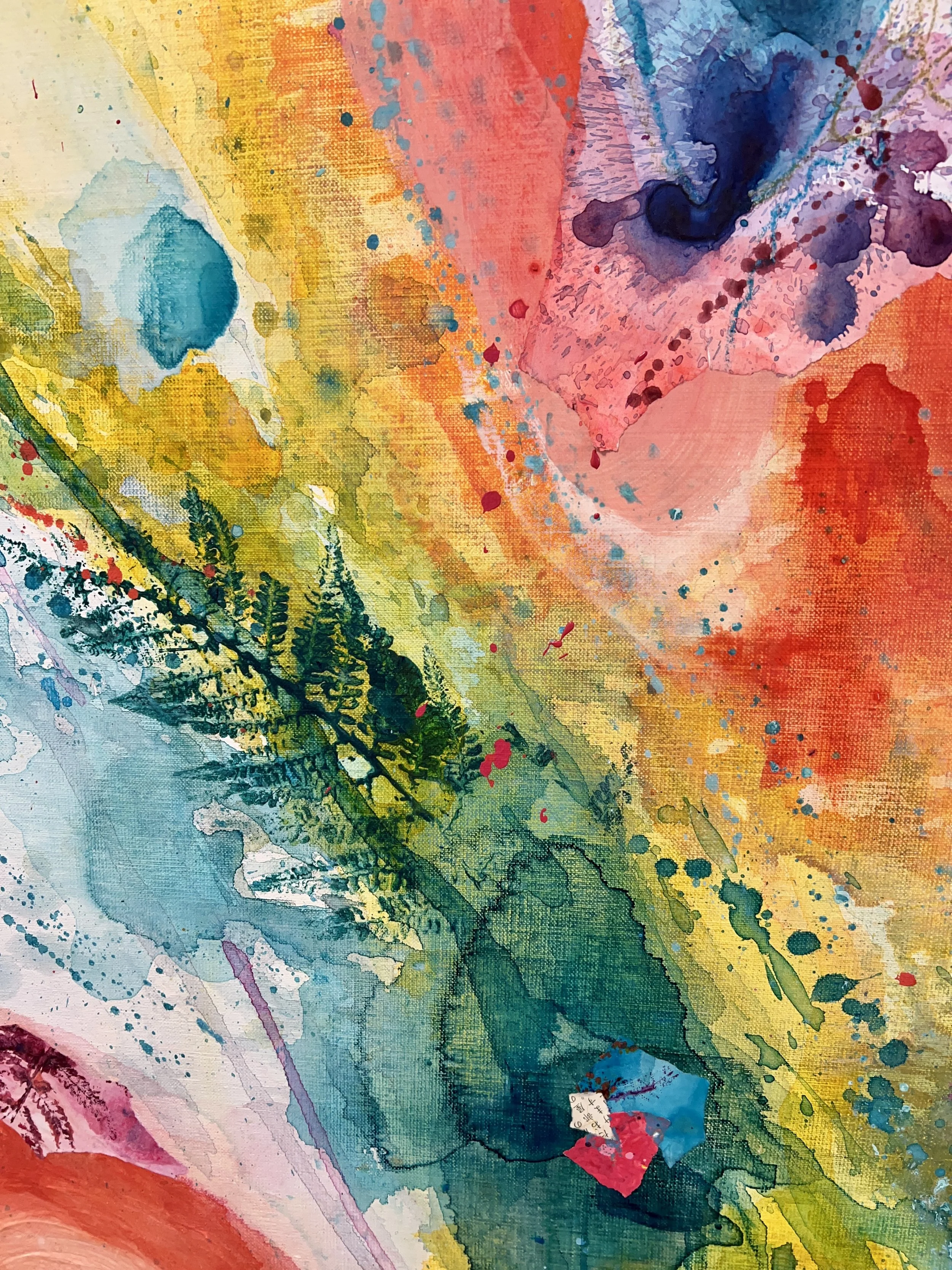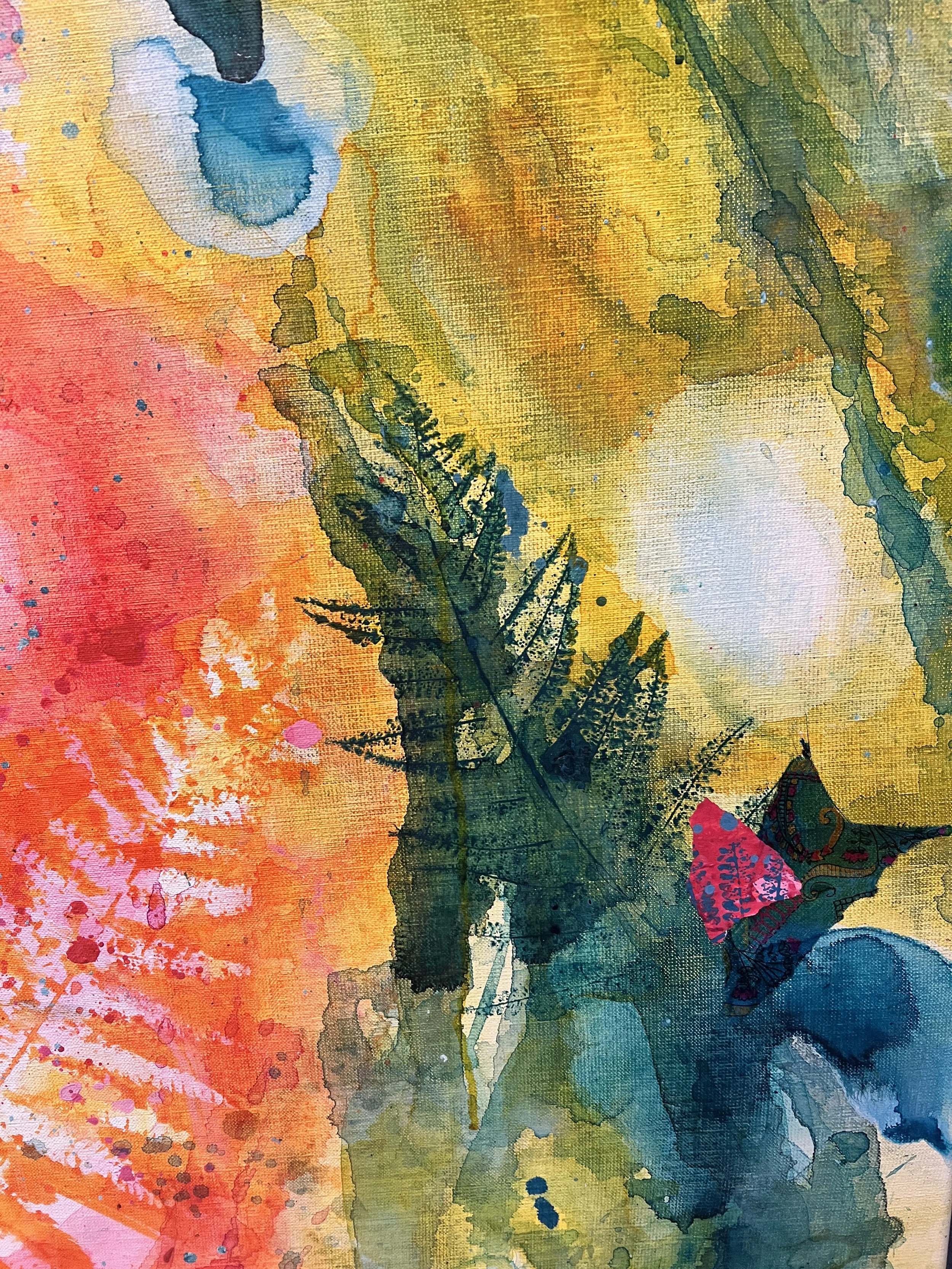 Watercolor, Japanese drawing ink, acrylic paints, Indian handmade paper infused with wax, pigments from Provence, Pakistani silk, textured paste with marble powder, French and Spanish sand on natural linen canvas.