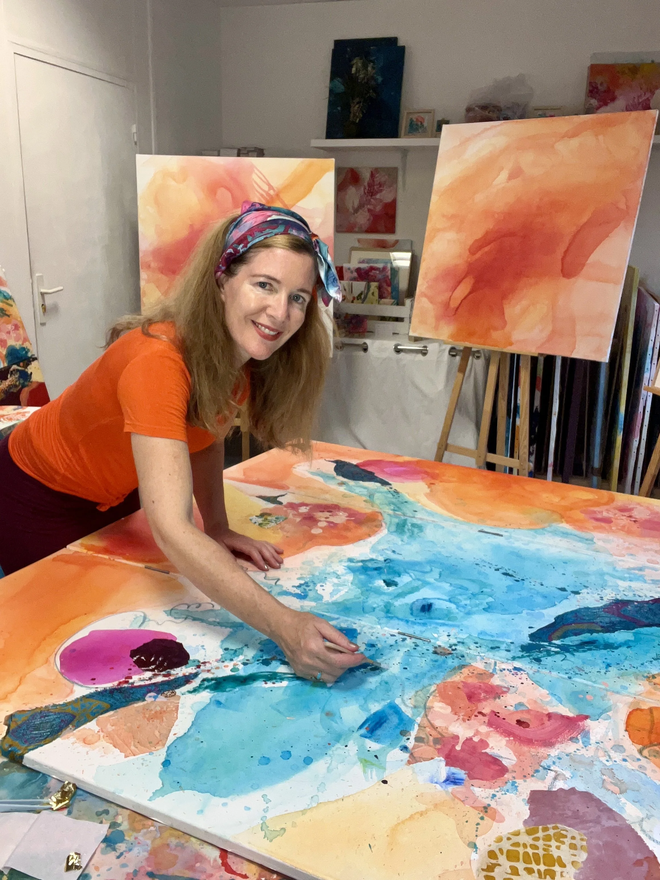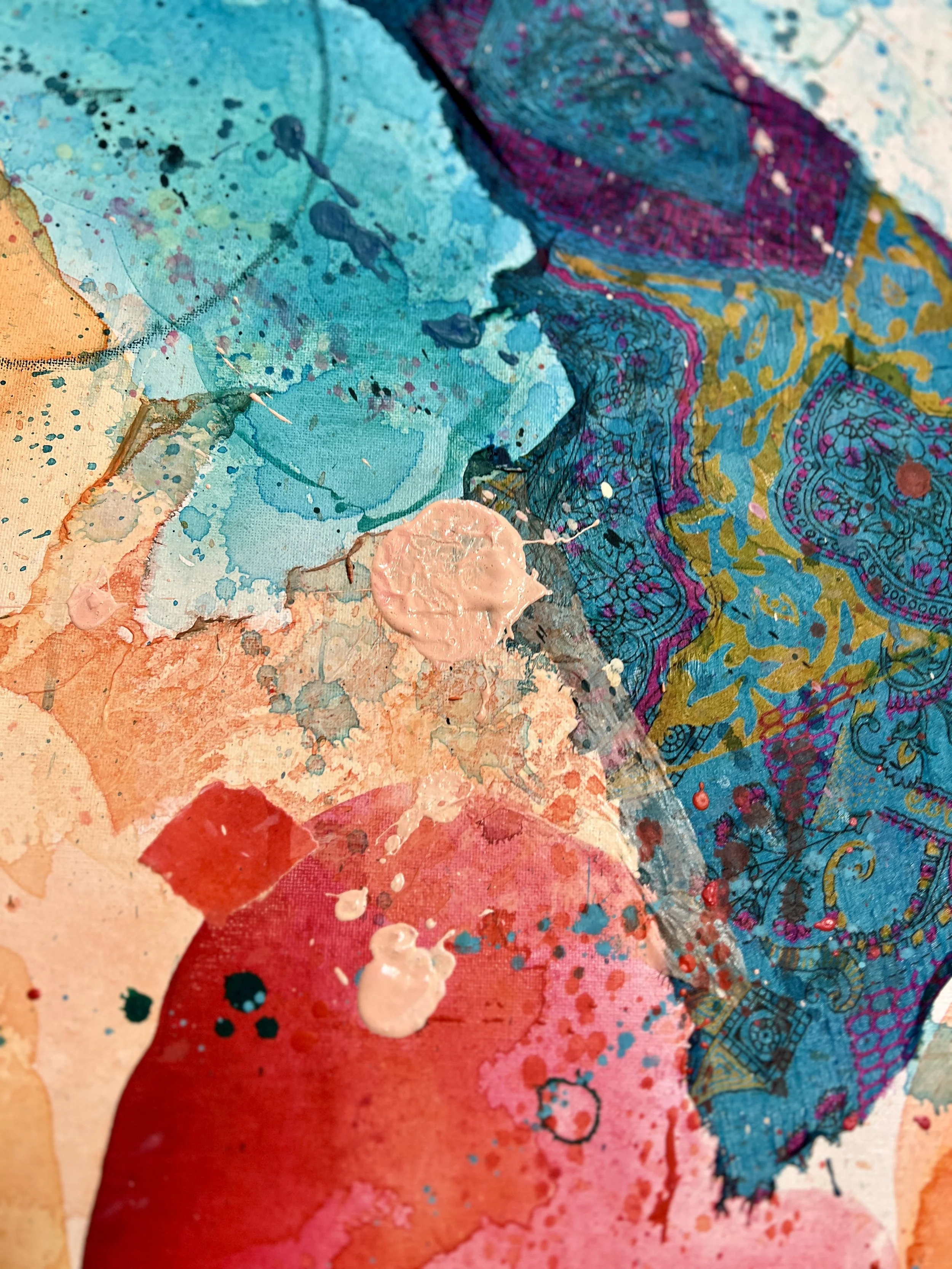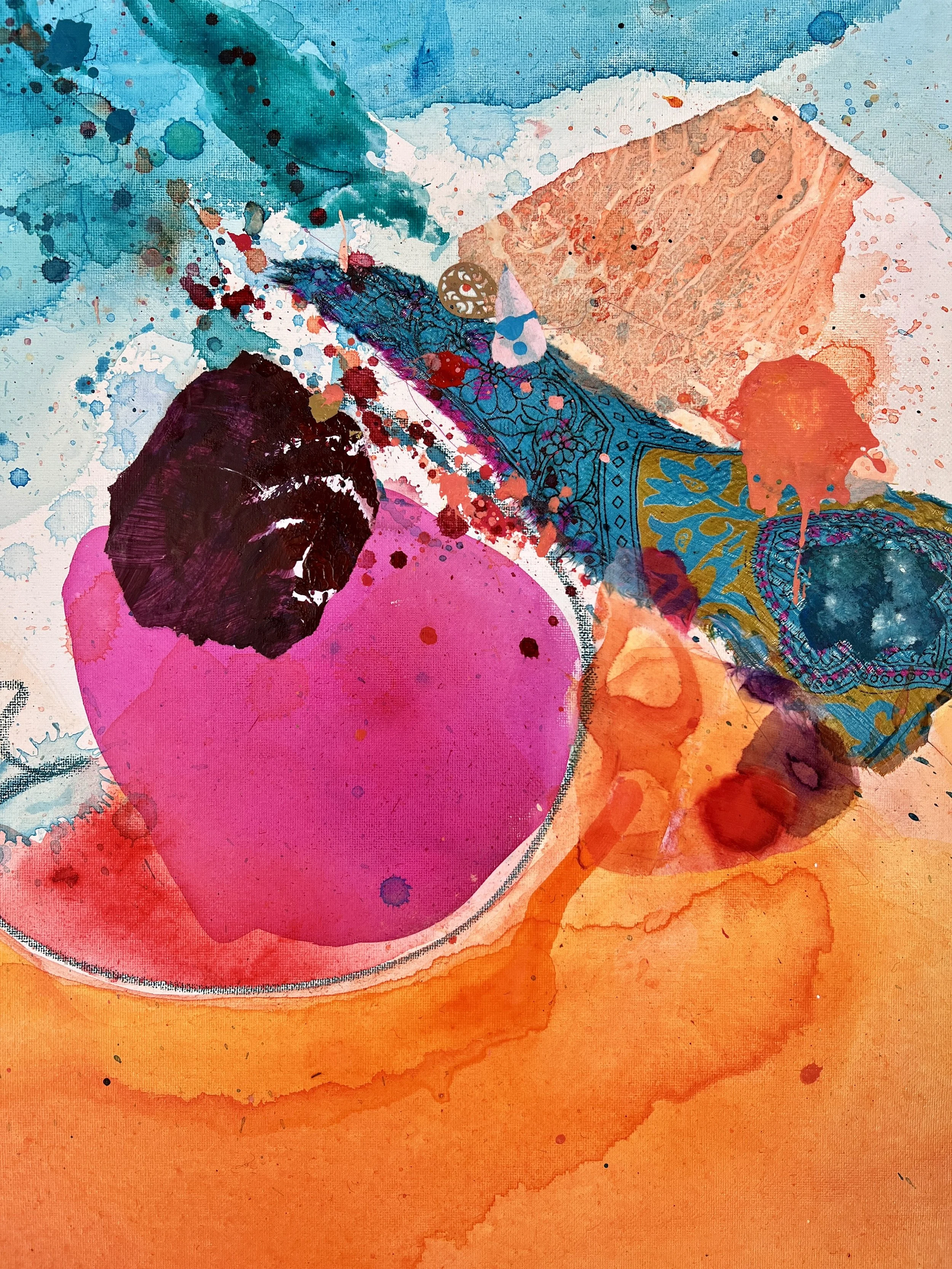 The colorful silk scarf fragments in the work "Orange Promise", reminiscent of jumping fish, move in the clear, turquoise-green water with delicate yet powerful movements. Unconditional love that sounds like an orange promise in our innermost being and whose melody floats far beyond the canvas.