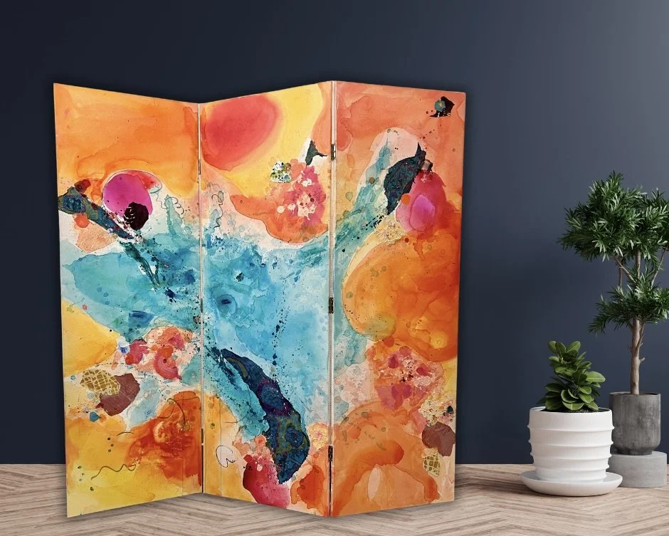 The bright orange penetrates the artwork like gentle rays of sunshine and fills the room with energy and vibrancy. The turquoise and blue nuances unfold in flowing movements reminiscent of the refreshing lightness of ocean waves.