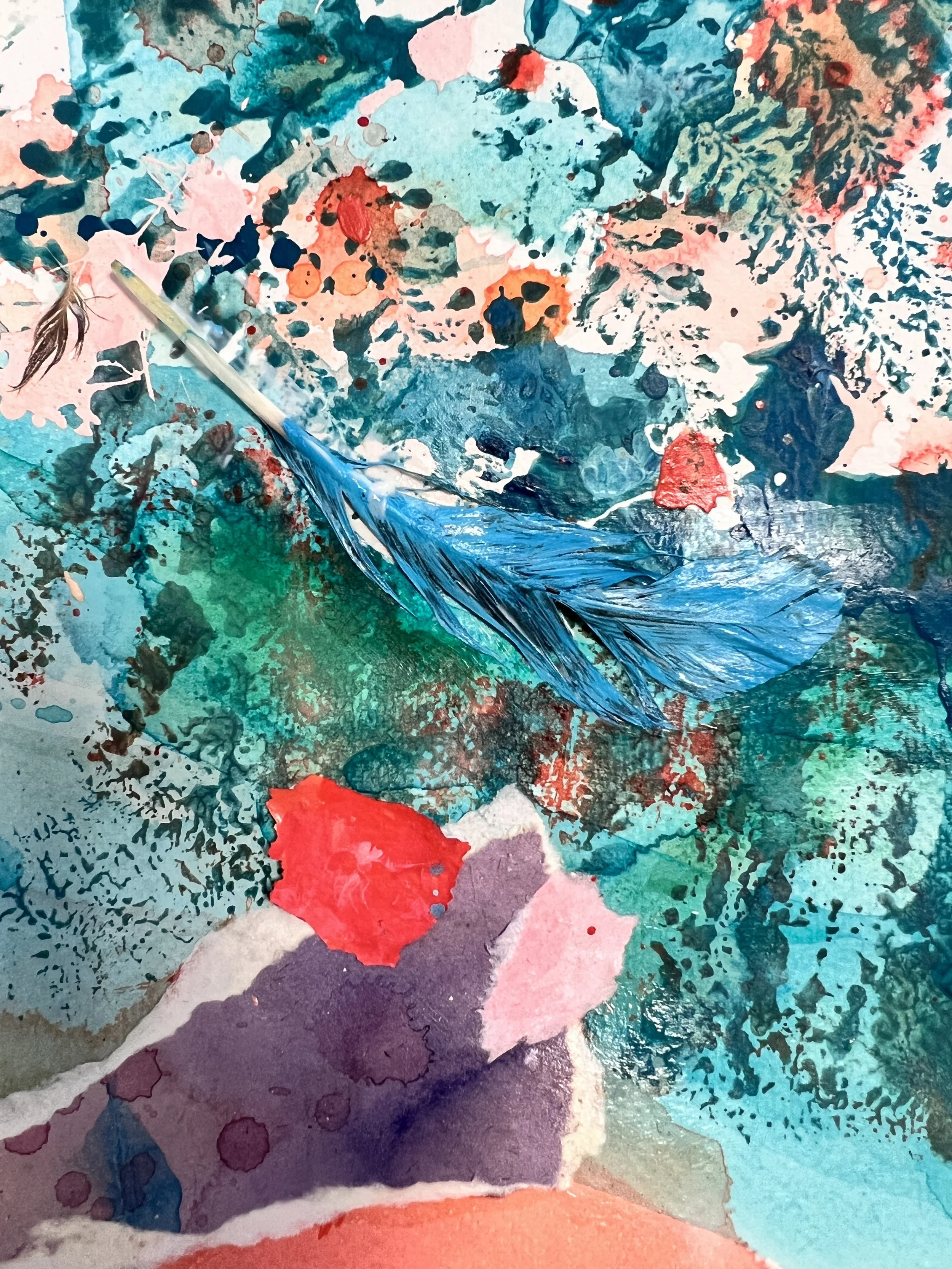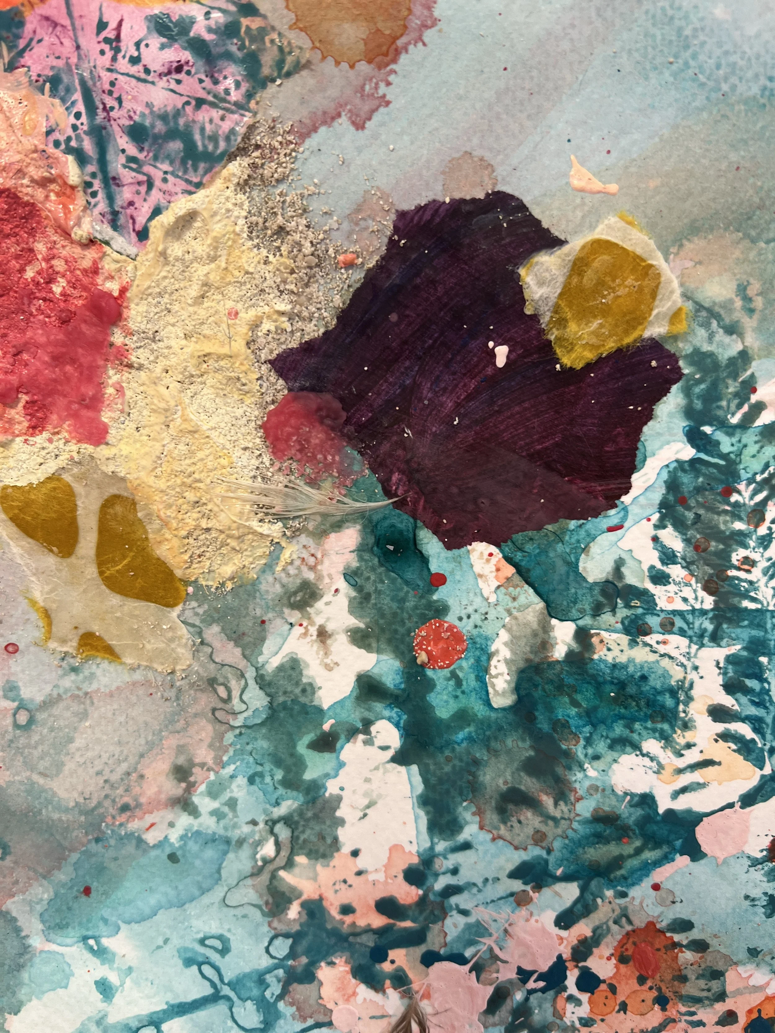 A delicate feather in the paper symbolizes change. Golden speckles and sandy textures from distant lands merge into an image of letting go and new beginnings. Every brushstroke tells of the power of finding growth in change.