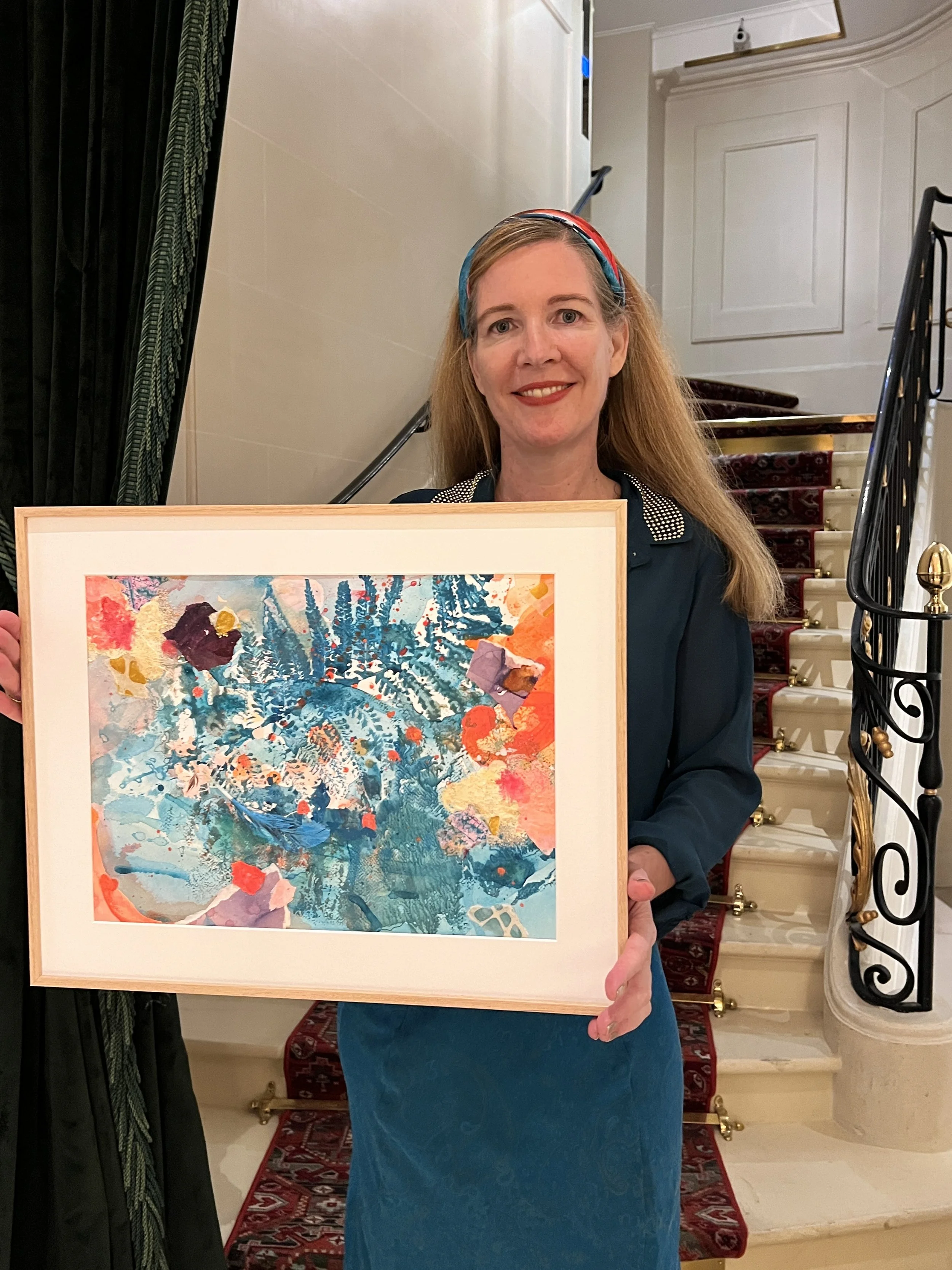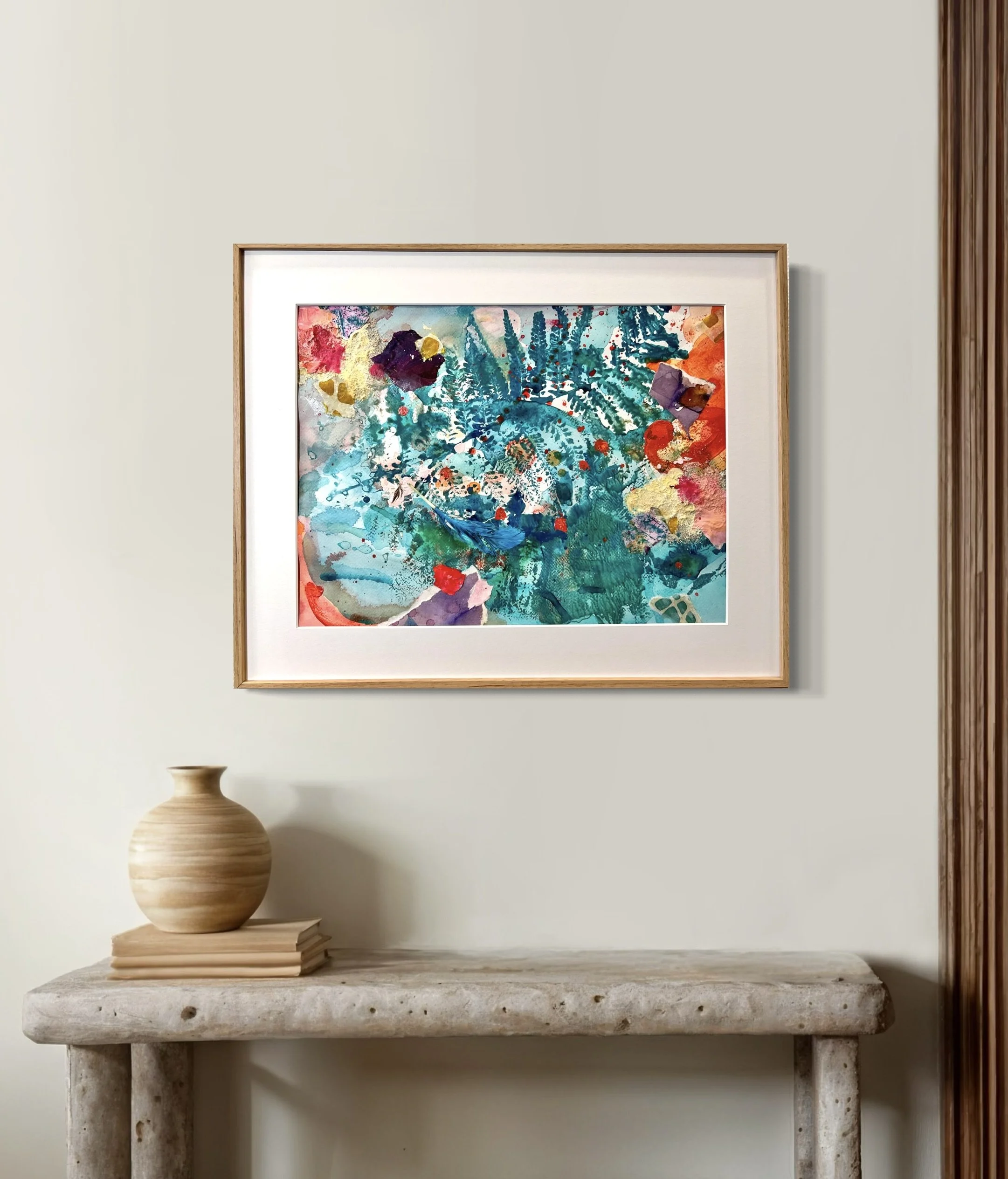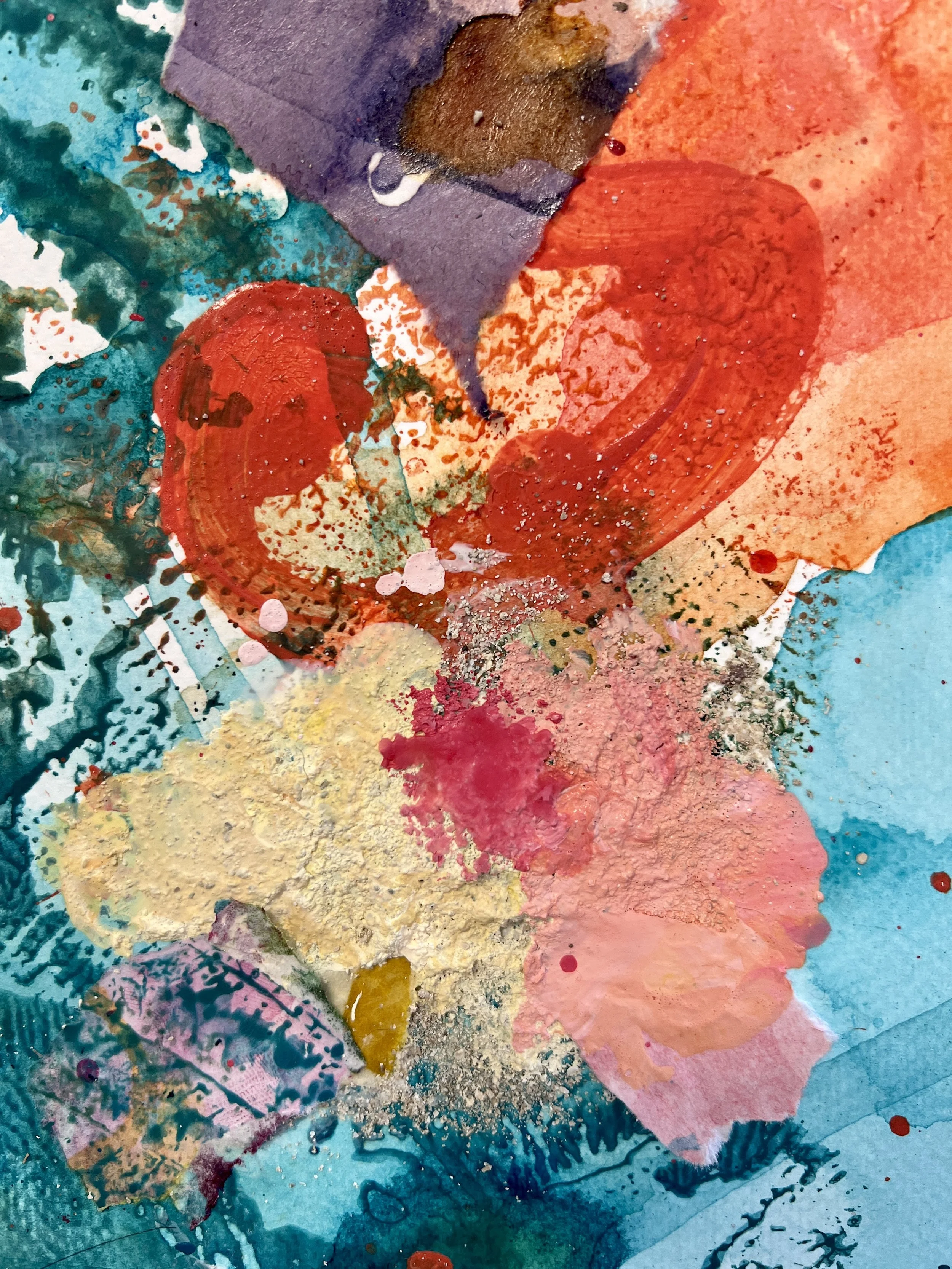 A glowing spark in the dark unfolds a kaleidoscope of vibrant colors in watercolor, Japanese ink and bold acrylic. In the swirl of turquoise, azure and emerald, you can feel the ashes of a phoenix on handmade paper soaked in wax. New life grows from these ashes - powerful and full of hope.