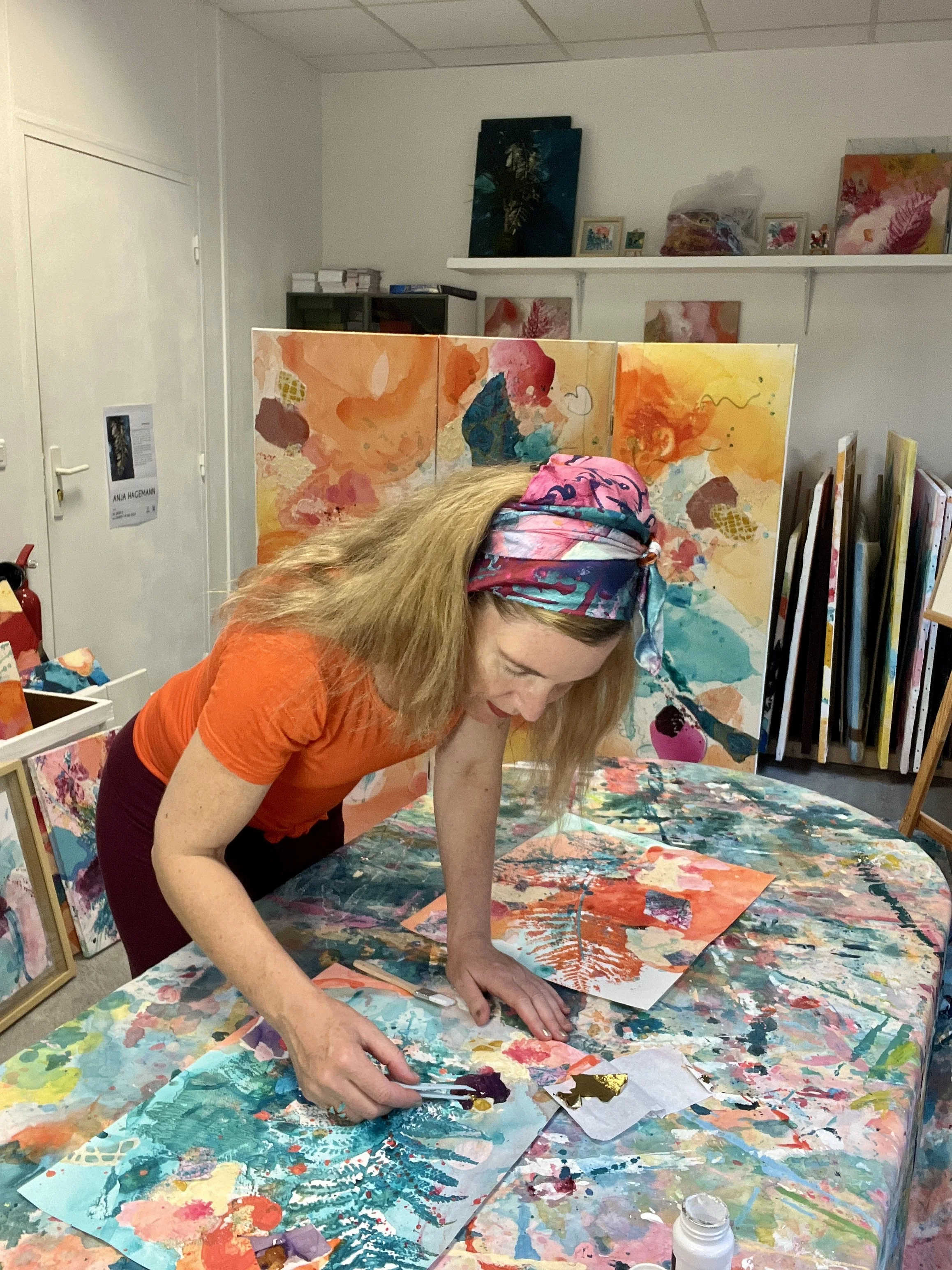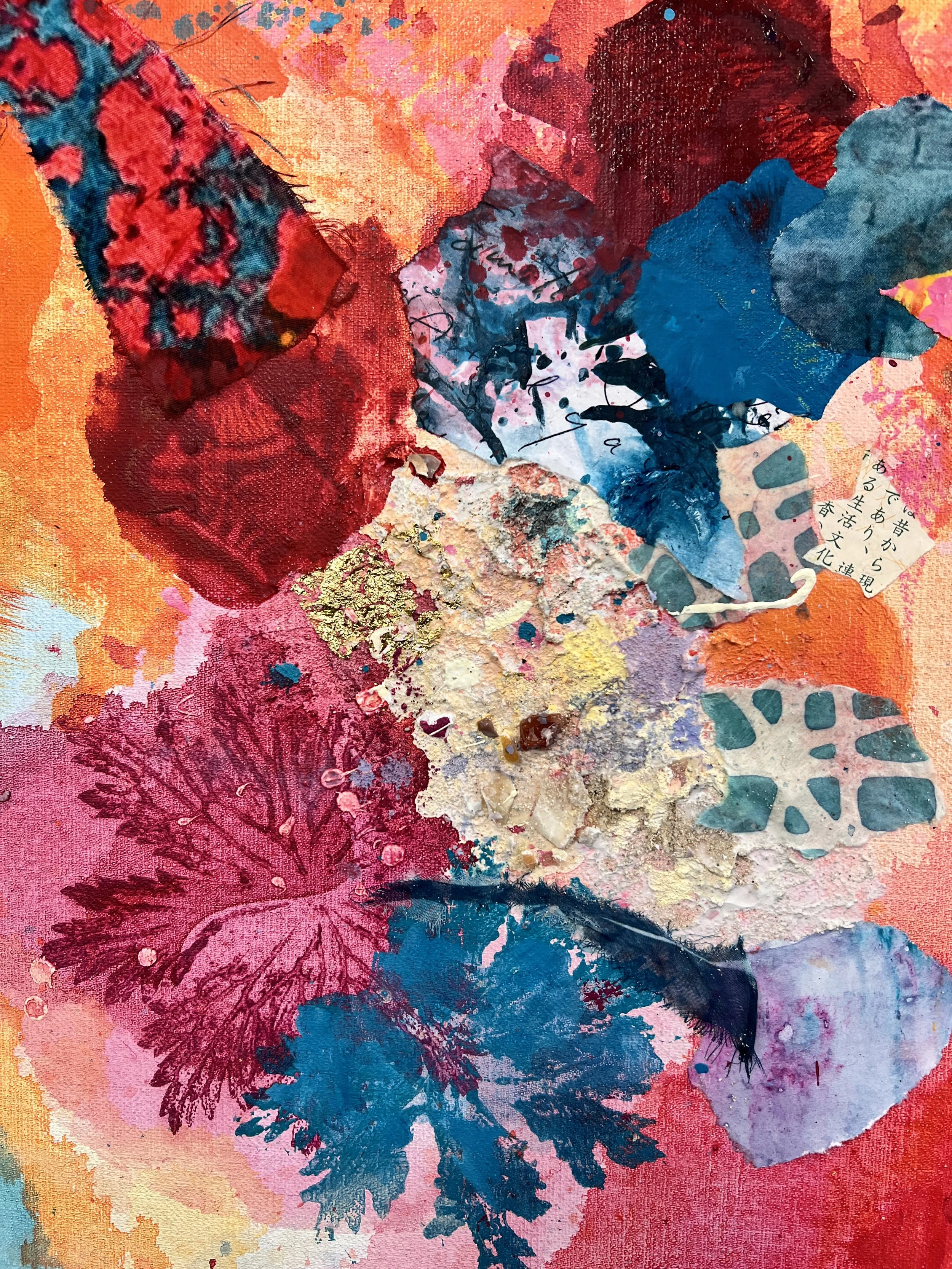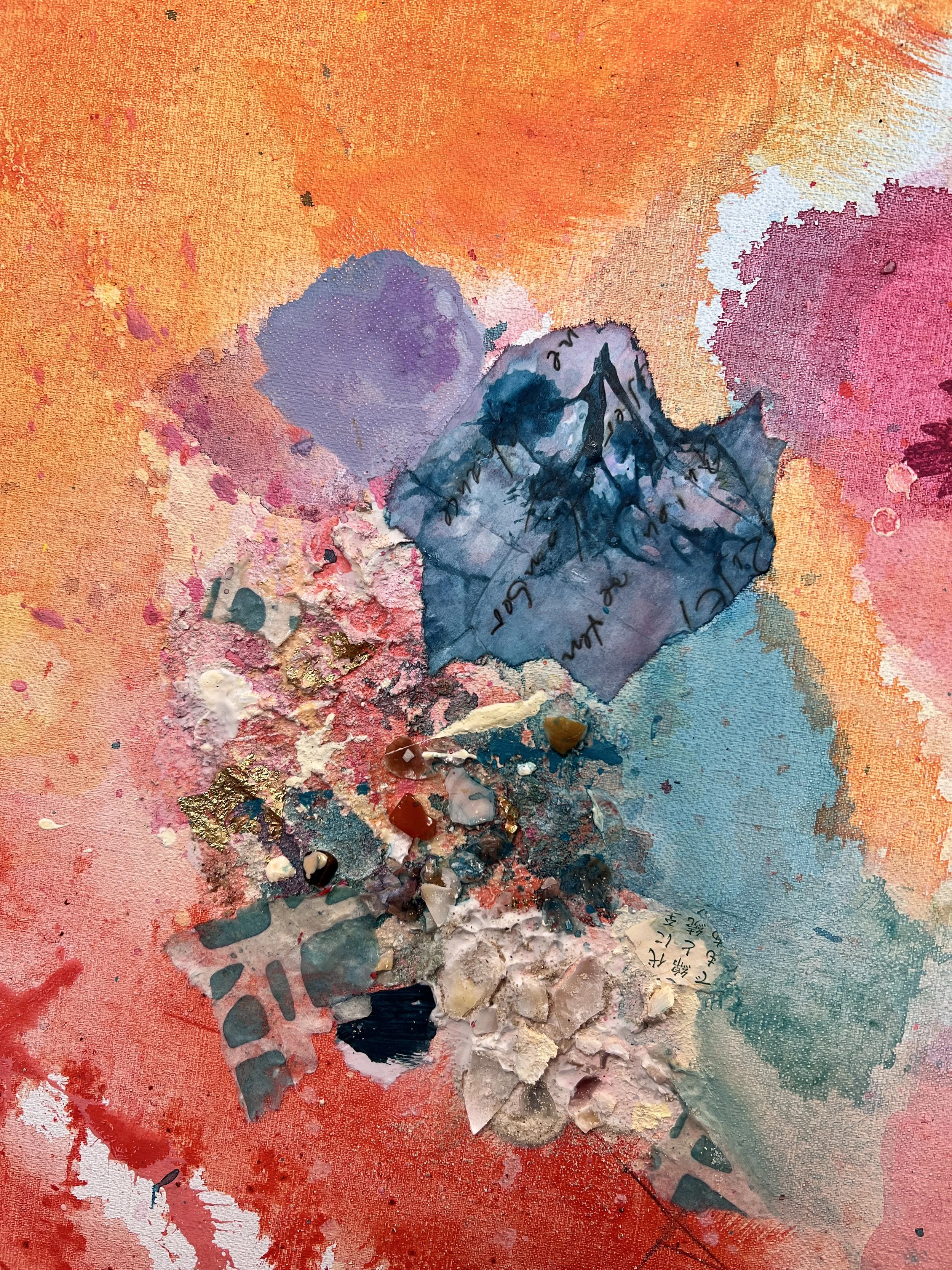 Collage elements: sand, gold leaf, pigments from Provence, handmade papers, shells, marble flour paste and twill silk fabrics.